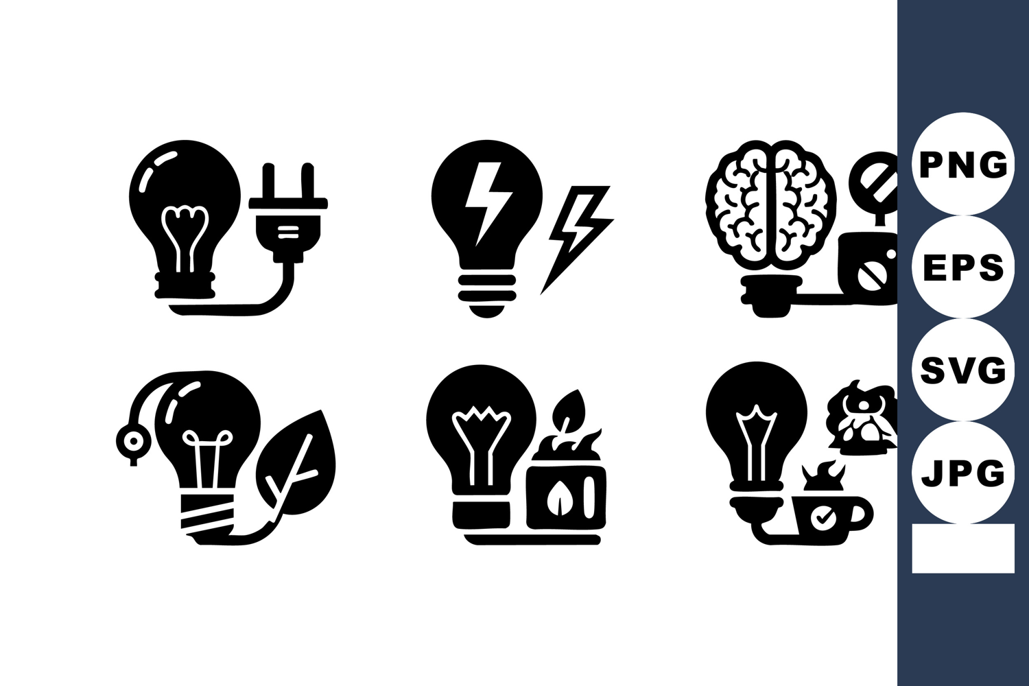This vector set features six creative light bulb icons combined with symbols like brain, coffee, leaf, and fire, representing innovation and energy in a minimalist style. Modern and inspiring.
