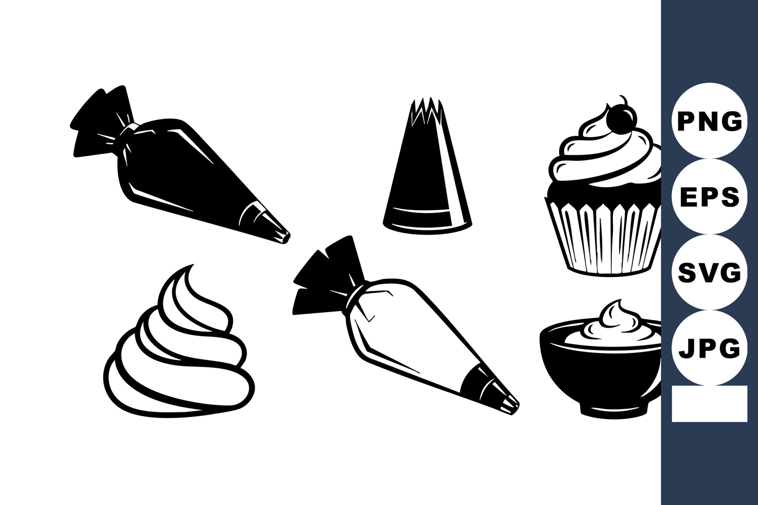 Vector set showing various cupcake frosting styles and piping bags, including swirls and cream dollops, ideal for bakery design projects. Simple and clean style, creative mood.