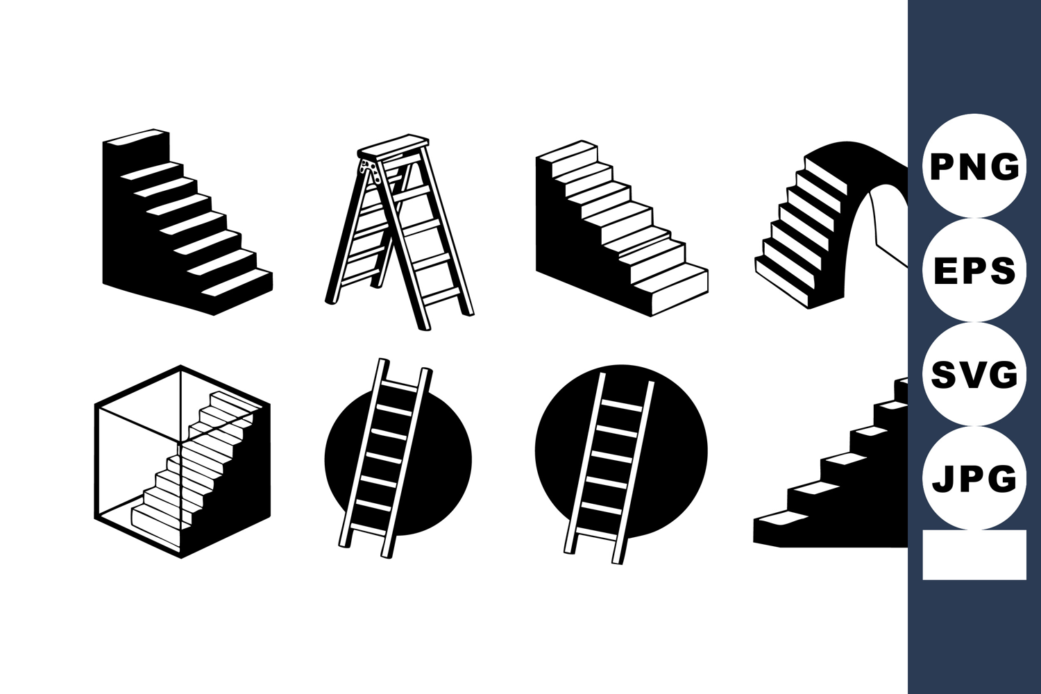 This vector collection presents diverse black stairs and ladders in geometric styles, showcasing steps, arches, and cubes with clean, modern design elements in a minimalistic mood.