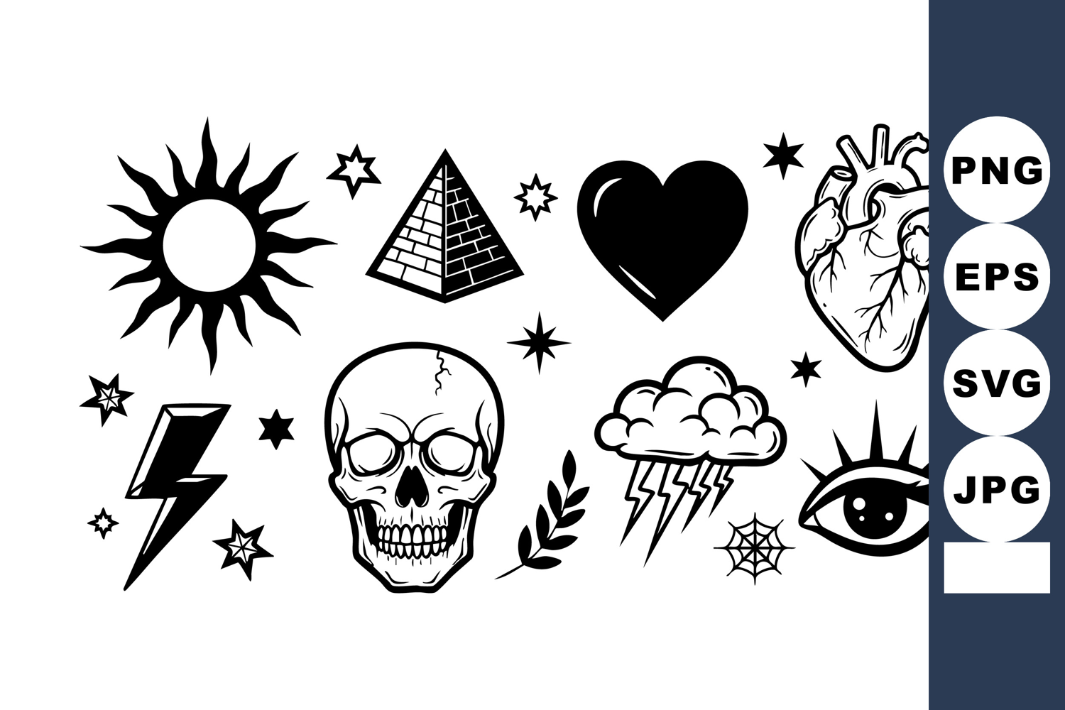 Illustration Vector Black Sun Skull Heart Eye White Lightning Pyramid