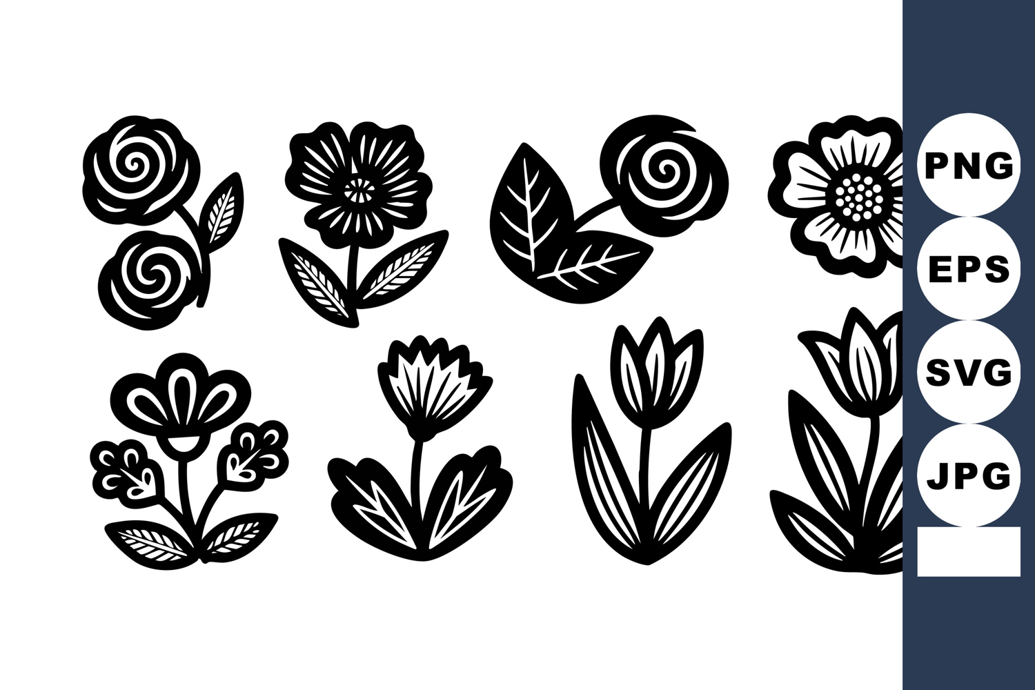This image shows black and white floral vector icons featuring different flower and leaf designs. The simple monochrome style suits decoration and design projects, creating a classic mood.