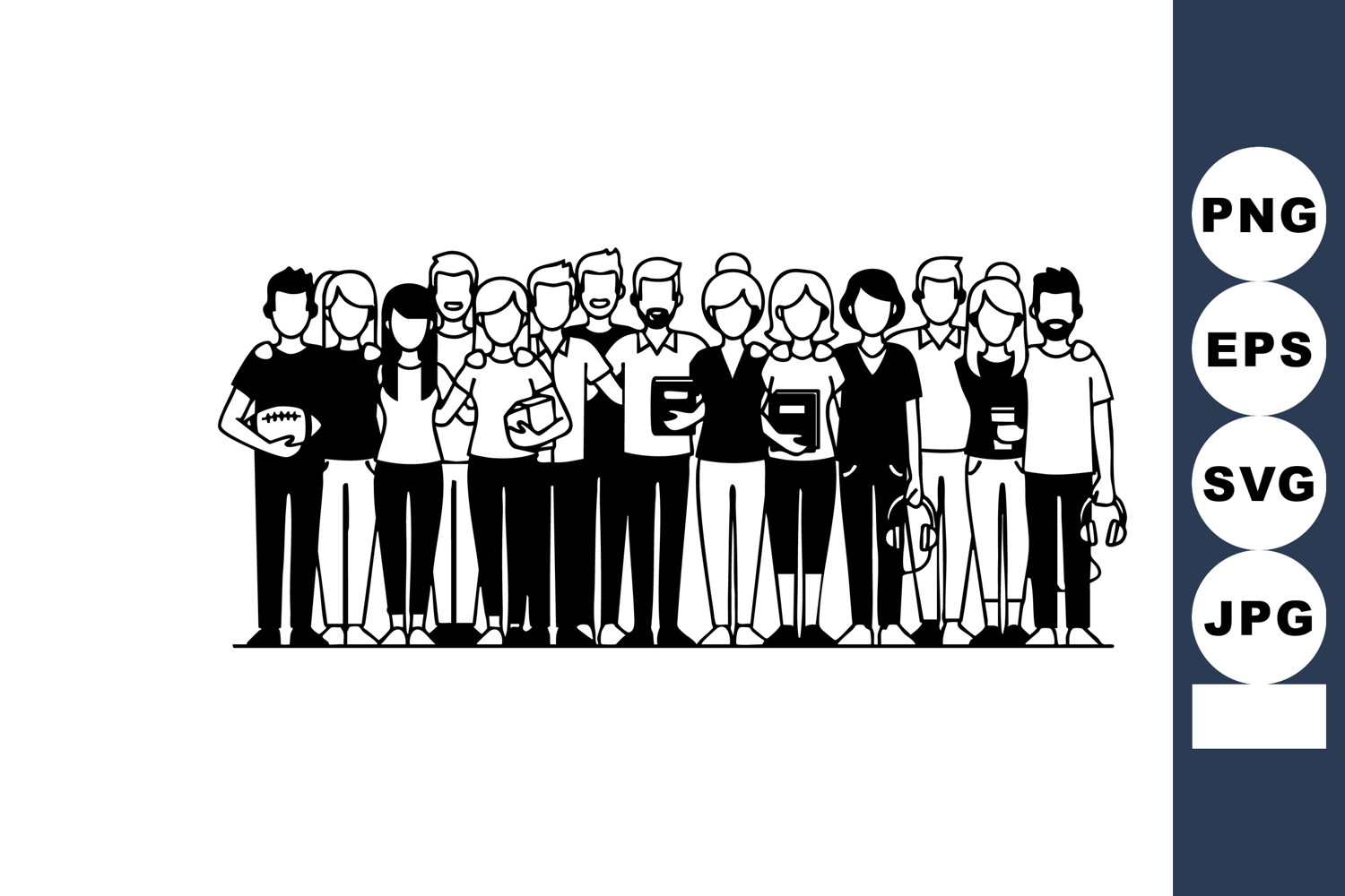 This vector shows a diverse group of people standing together, symbolizing unity and teamwork in a professional environment. The image conveys cooperation and inclusiveness. Positive mood.