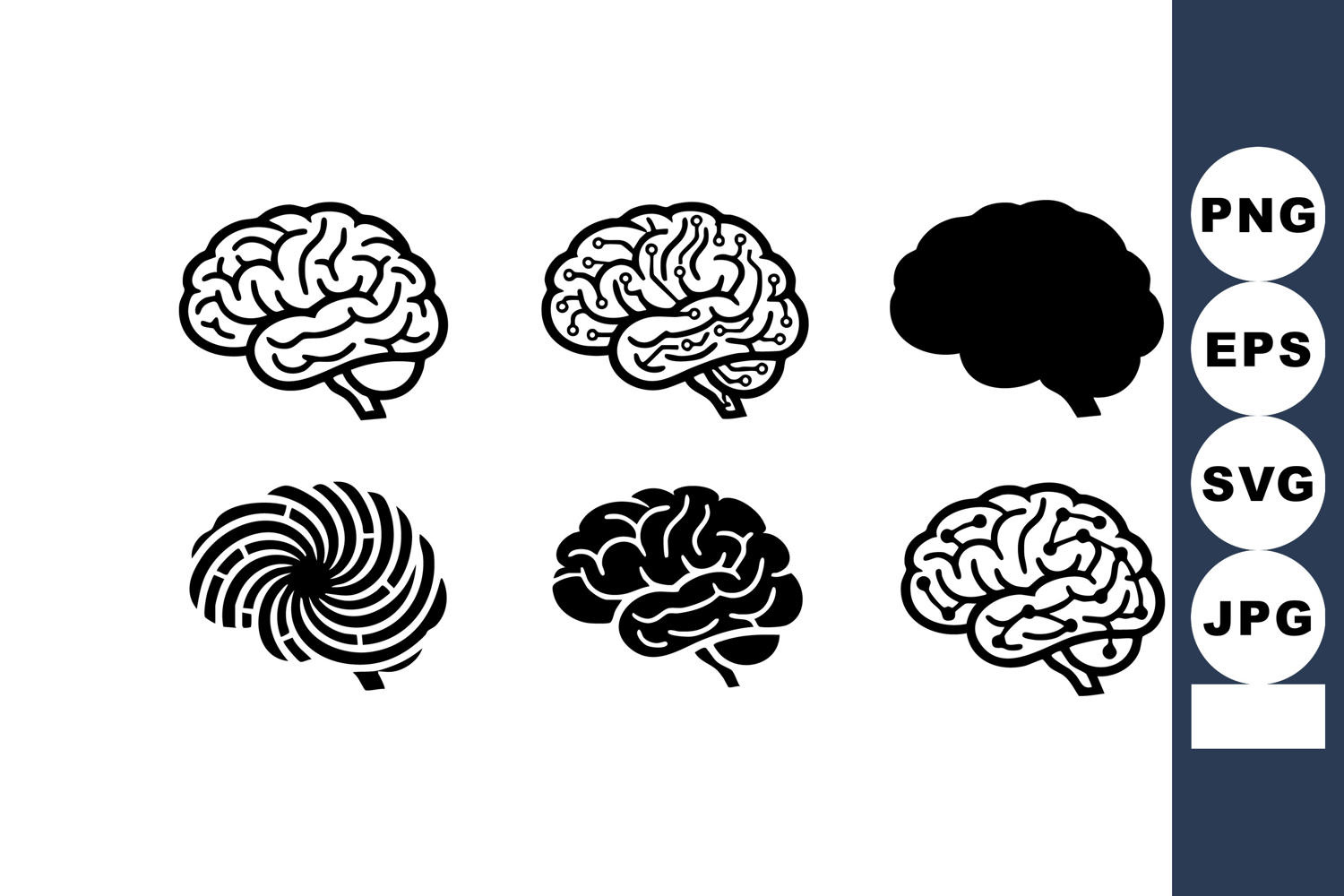 This image presents six black and white brain icons in various styles and perspectives, ideal for educational or creative use. The design is clear and minimalistic, conveying intelligence and thought. Calm.