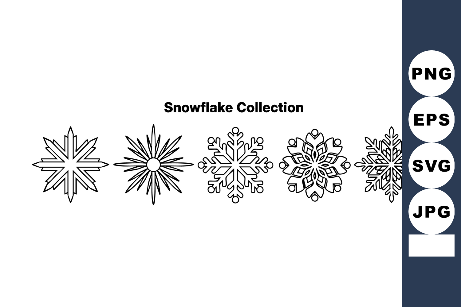 This vector image features five distinct snowflake designs arranged in a row, showcasing winter and holiday themes with symmetrical and delicate patterns, creating a festive and crisp mood.