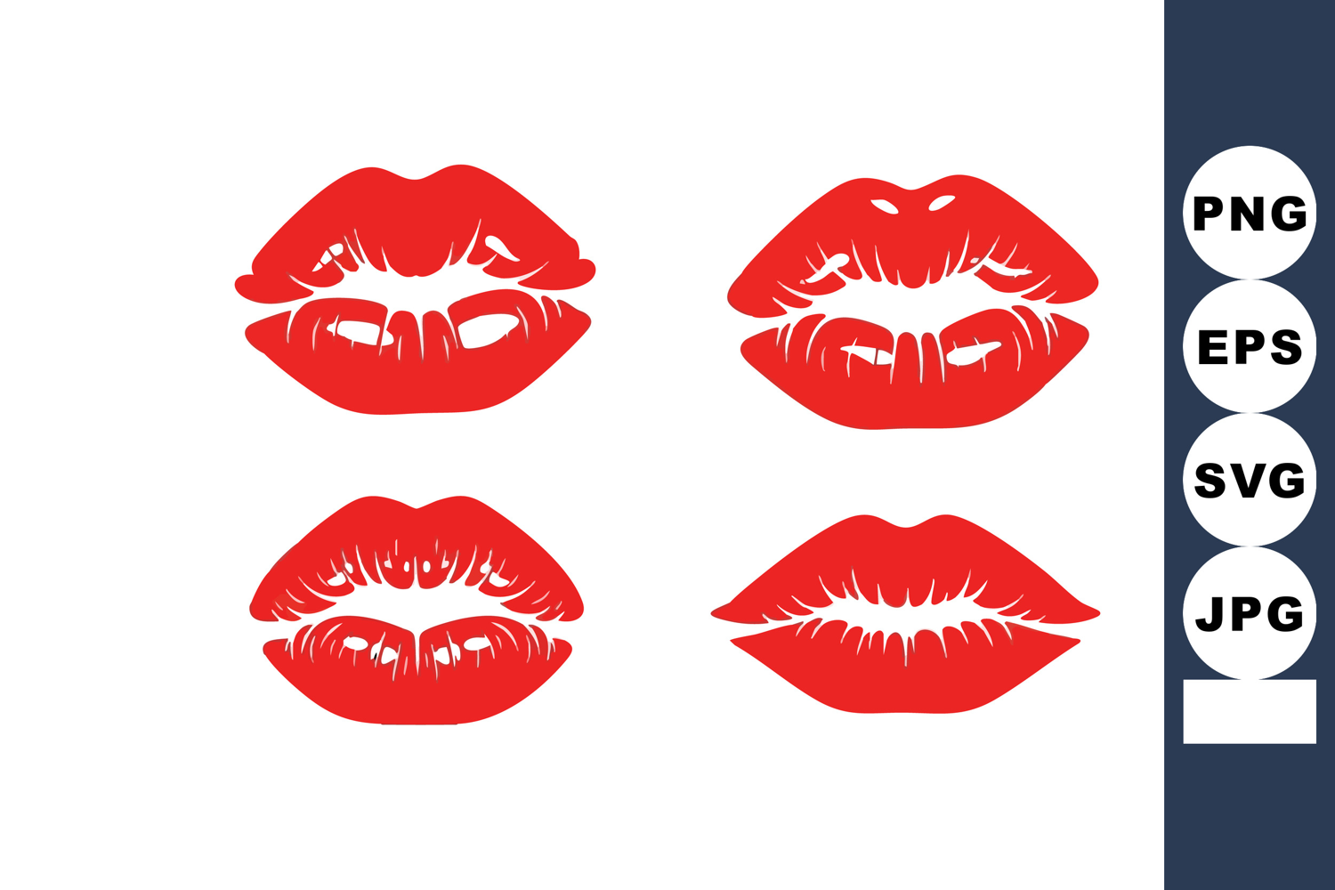 Vector file shows four red lips kiss marks with distinct shapes and styles, suitable for design, decoration, or romantic themes, rendered in a clean graphic style. Playful mood.