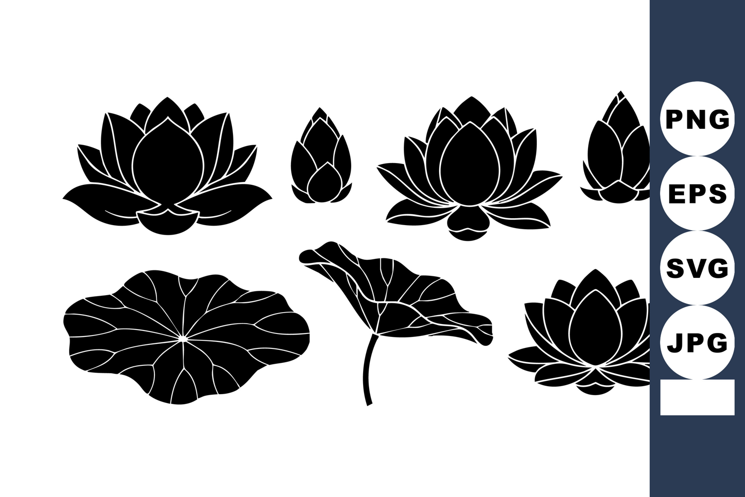 This vector set shows lotus flowers, buds, and leaves in black silhouette style, suitable for floral designs and decorations. Clean and elegant mood.