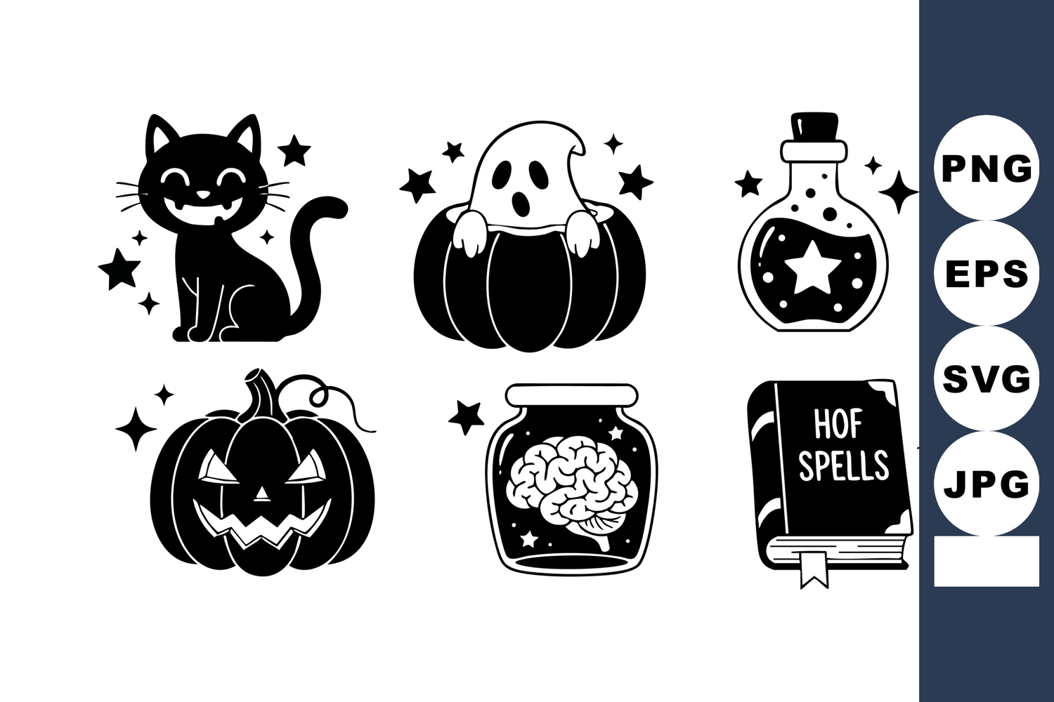 This vector illustration features spooky Halloween icons including a black cat, jack-o-lanterns, ghost, potion bottle, brain in a jar, and spell book with stars, creating a fun eerie mood.
