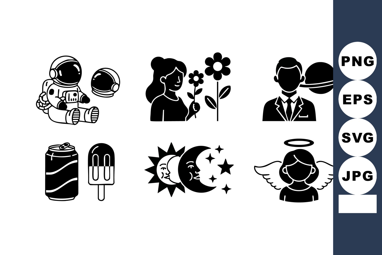 Vector icons depict space elements such as astronaut, helmet, planet, sun and moon, angel, and food items with clear black silhouettes in a simple style, creating playful mood.