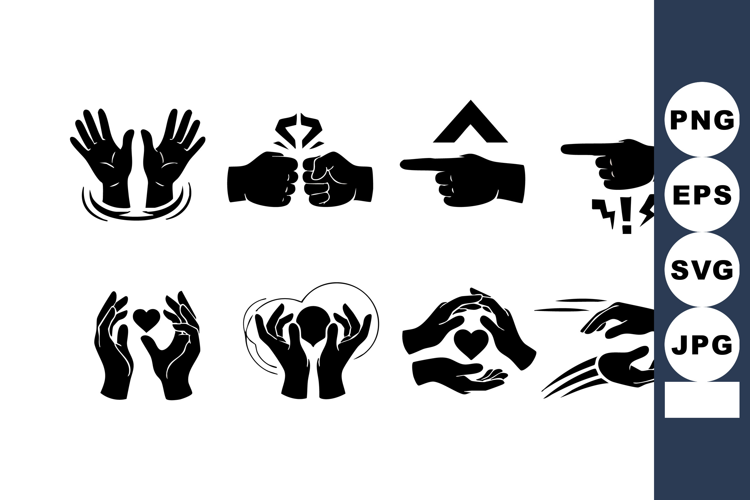 Black silhouette hand gesture icons show different symbolic expressions for communication and design use. Simple, clear, versatile, and modern style. Effective visual language. Minimalist mood.
