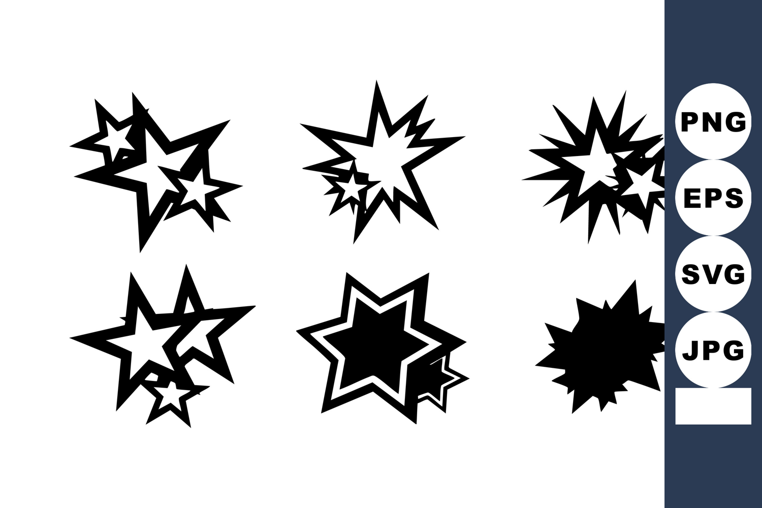 This vector file features six black star shapes with different pointed and starburst styles, ideal for graphic design and decoration, showcasing bold and dynamic silhouettes. Energetic mood.