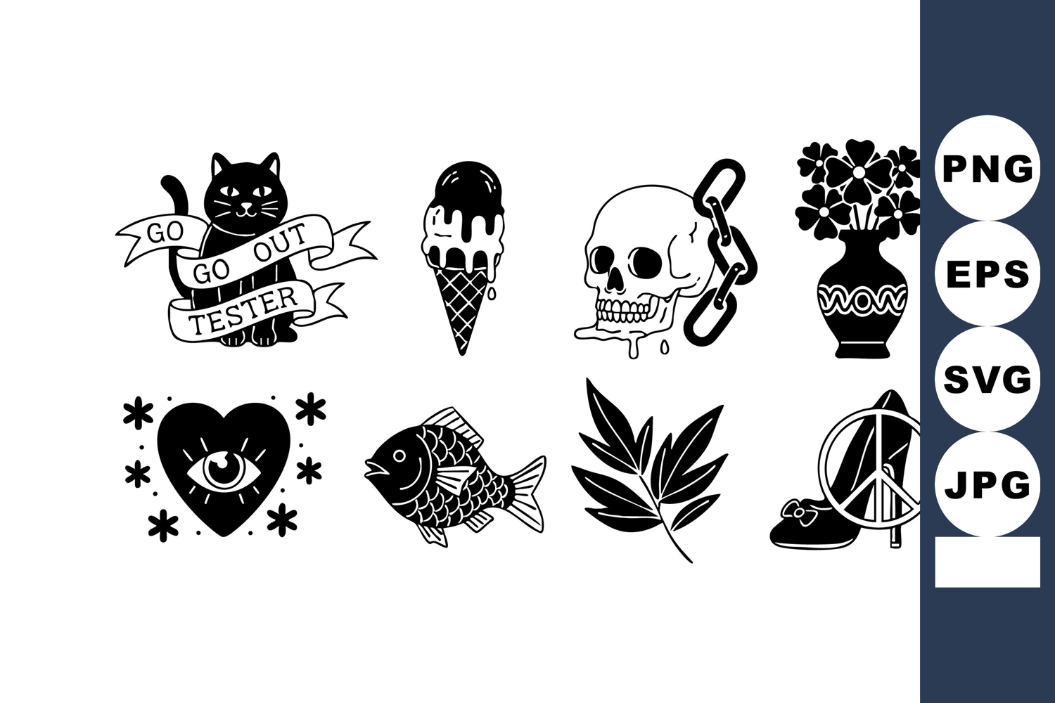 This vector file presents black and white vintage style icons featuring a cat, ice cream cone, skull with chain, flower vase, heart with eye, fish, leaf, and peace symbol, creating nostalgic mood.