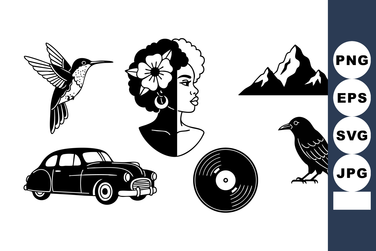 This vector features a vintage car, hummingbird, crow, mountain, vinyl record, and a woman’s profile with floral hair, all in black and white. The composition is artistic and nostalgic. Calm.