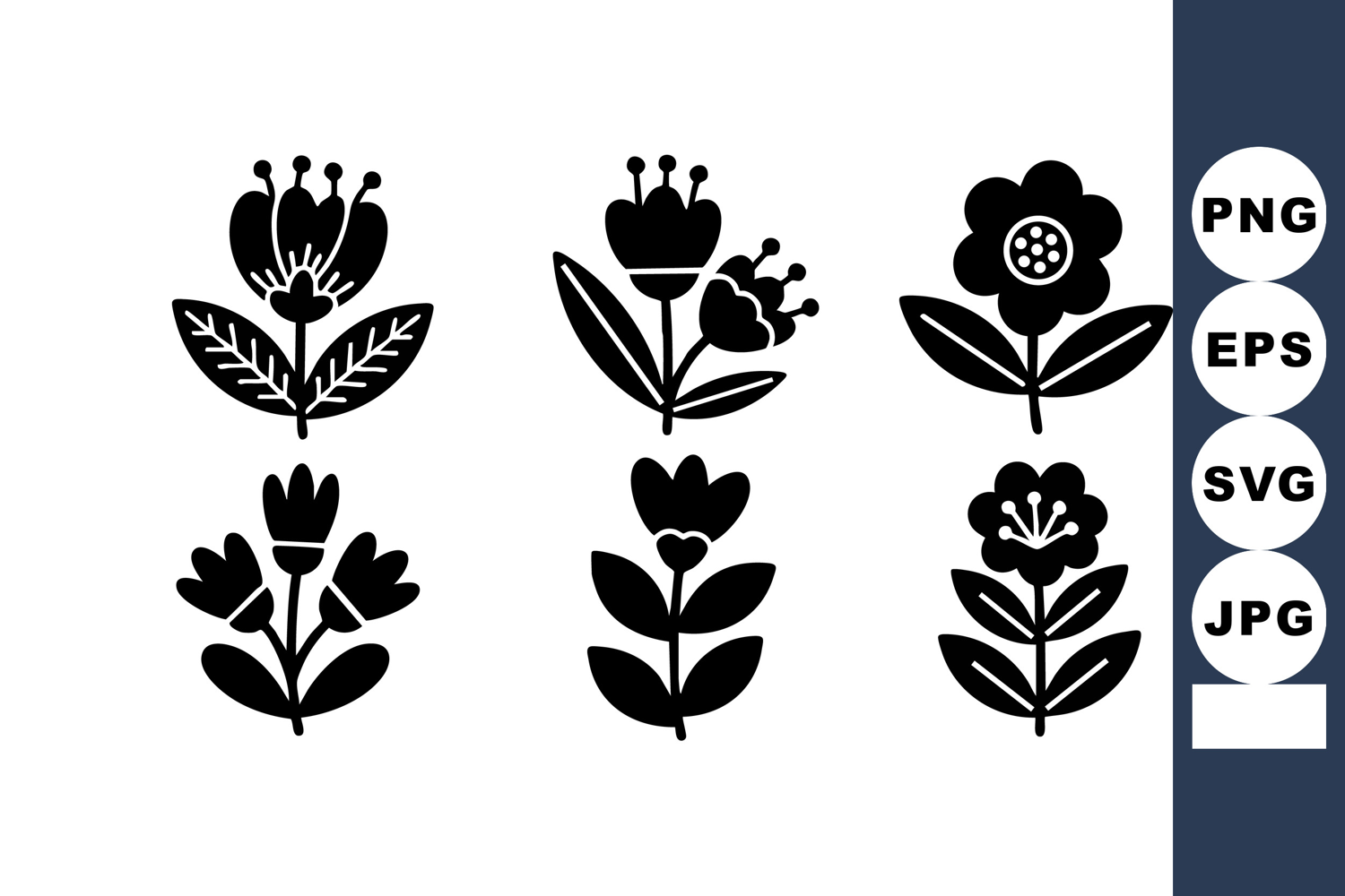 This vector features six black and white stylized flower icons with leaves, perfect for decorative and design uses. Simple, elegant, and versatile vector graphic. Calm and minimalistic mood.