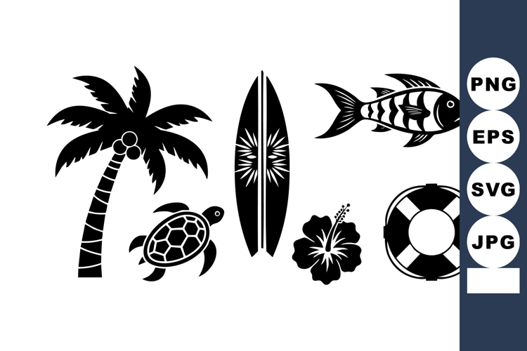 Black and white tropical beach icons include palm tree, turtle, surfboard, fish, hibiscus flower, and life buoy, presented in vector style, evoking a relaxed and summery mood.