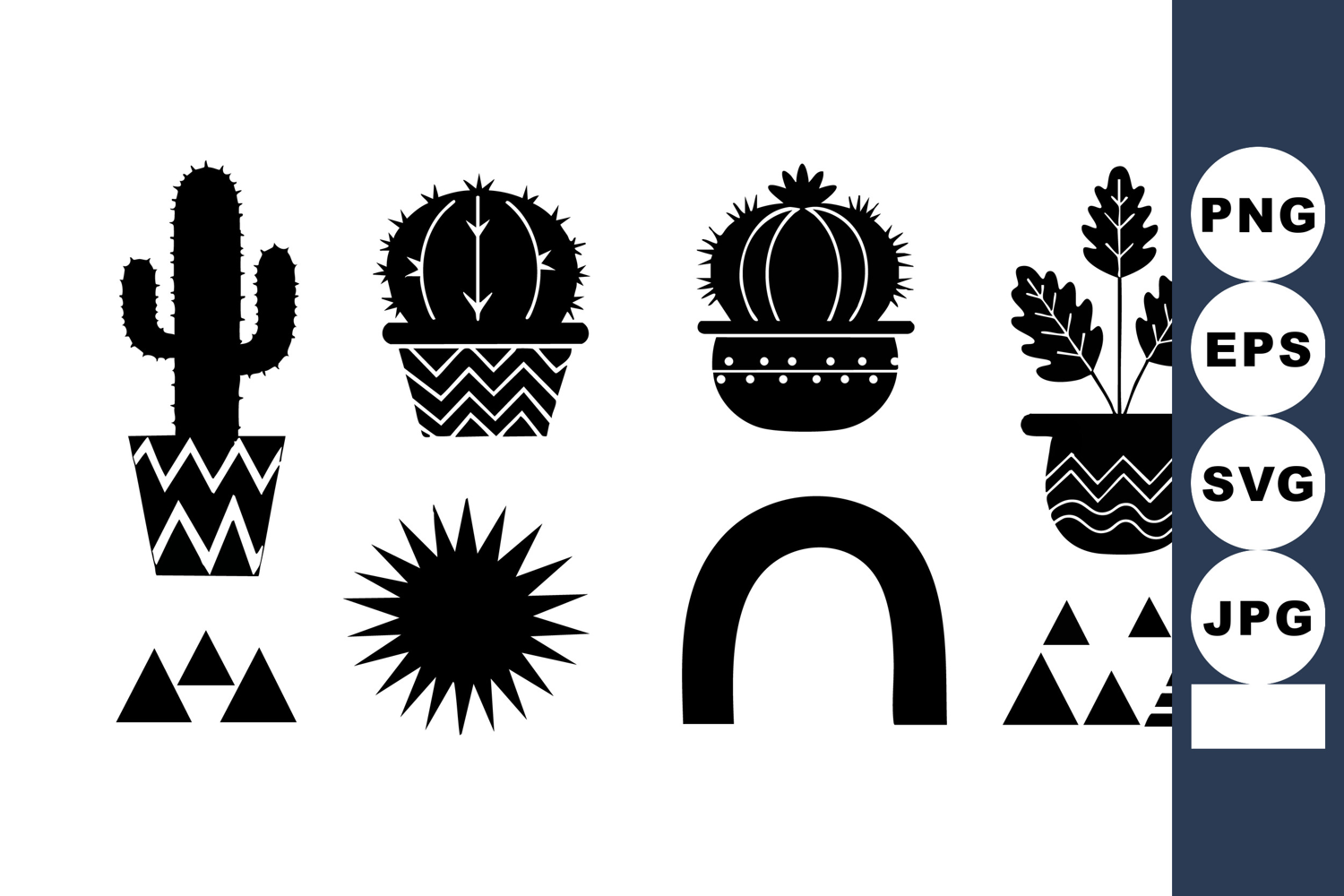 Vector art features black silhouette cactus and succulent plants in geometric pots with desert symbols like sun and arches, creating a minimal and modern botanical design. Calm mood.