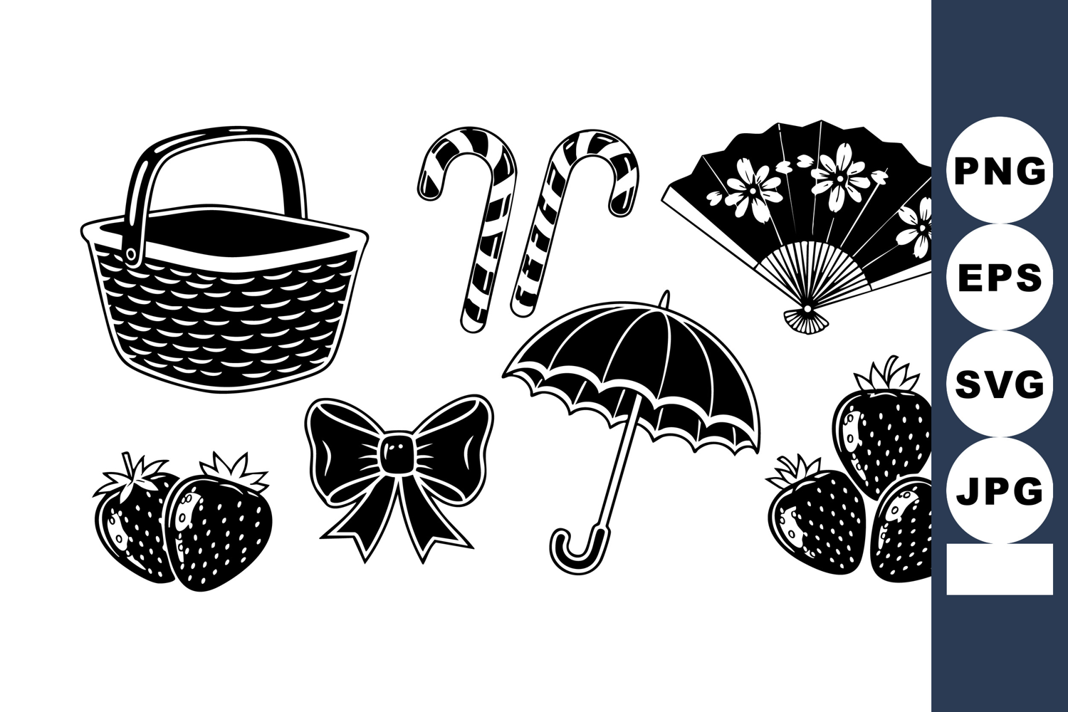This image shows a set of vintage black silhouettes featuring an umbrella, basket, candy cane, bow, fan, and strawberries in a simple vector style. Elegant and classic.