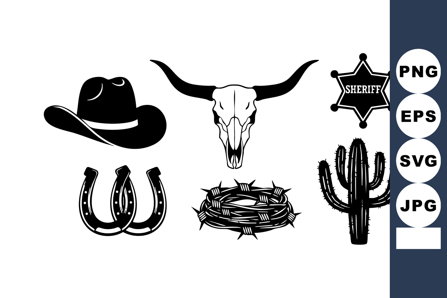 Vector set features classic western symbols including cowboy hat, longhorn skull, sheriff badge, horseshoes, barbed wire, and cactus in black silhouette style. Rustic and bold mood.