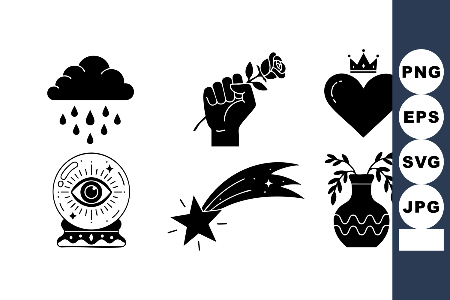 This vector set features symbolic black icons such as a rain cloud, raised fist holding a rose, crowned heart, mystic crystal ball, shooting star, and a vase with branches, presented in a minimalist style. Calm and mysterious.