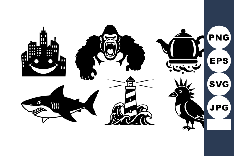 This vector file shows black silhouette icons including a roaring gorilla, cityscape with smile, shark, lighthouse, teapot, and crow, all in clean minimalistic style. Bold and striking.