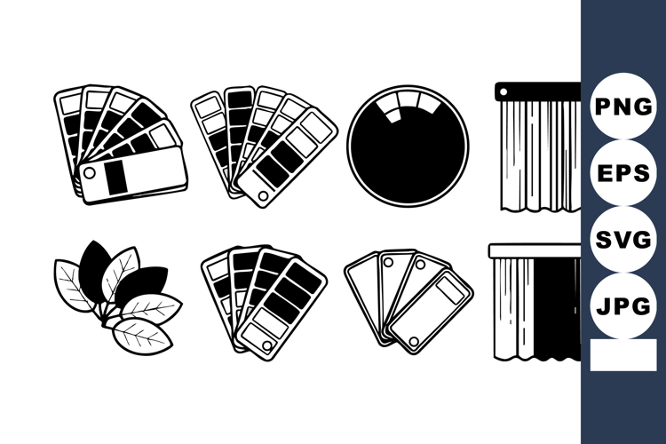 Black and white vector image showing various color swatches, curtain samples, and leaves used in interior design and fabric selection, conveying creativity and style.