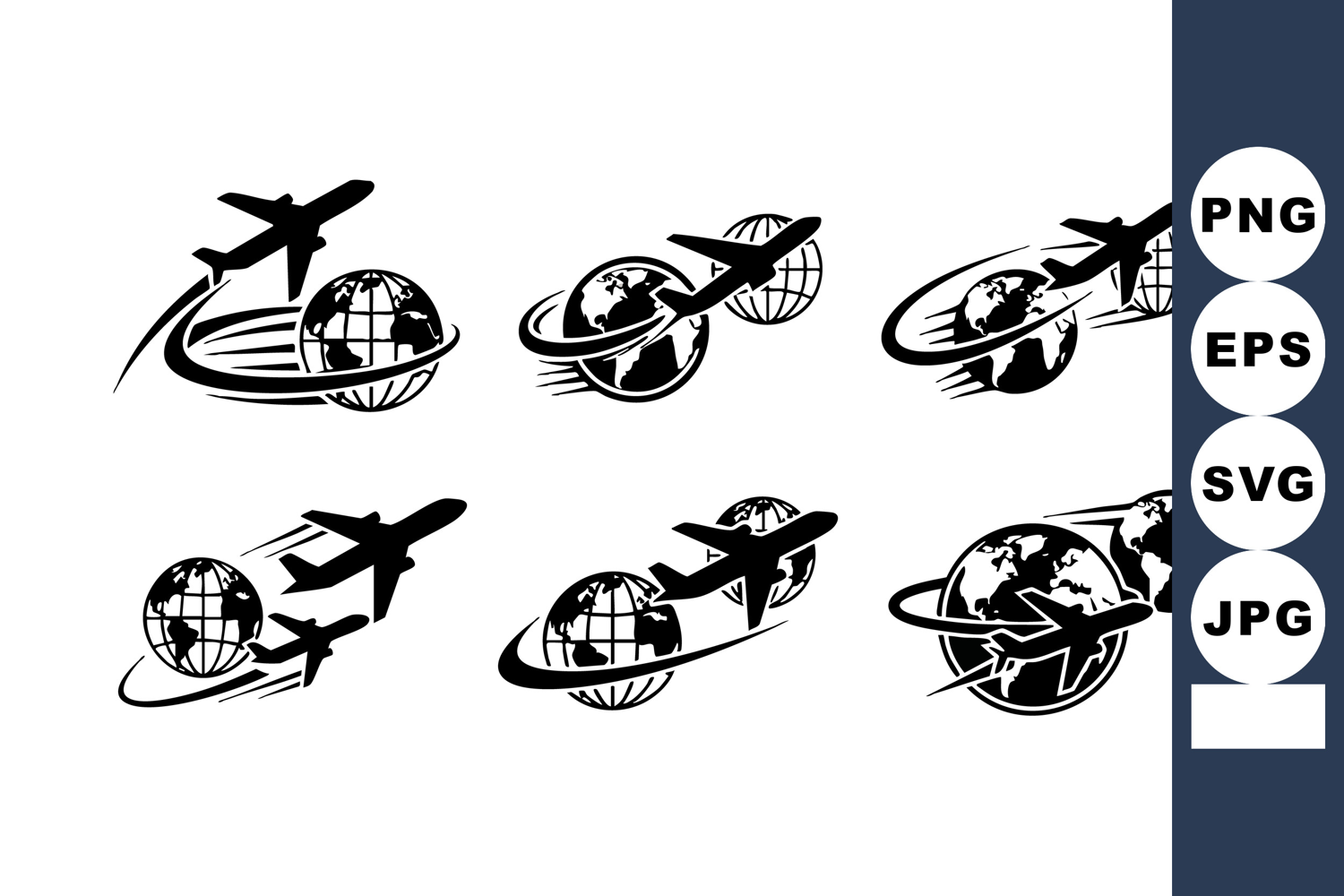This vector set shows airplane icons circling a globe representing international travel and global transportation in a sleek black design. The style is modern and dynamic. Energetic mood.