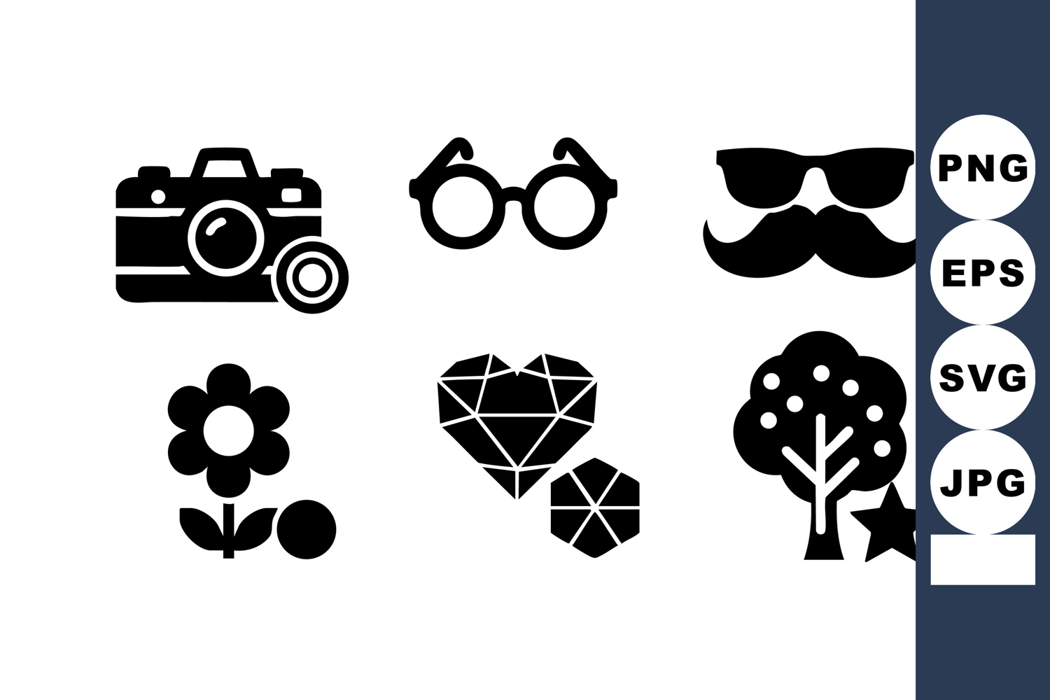 This vector file features black icons of a camera, glasses, mustache, flower, heart, and tree with star, designed for versatile creative and digital applications. Clean and bold style creates modern appeal.