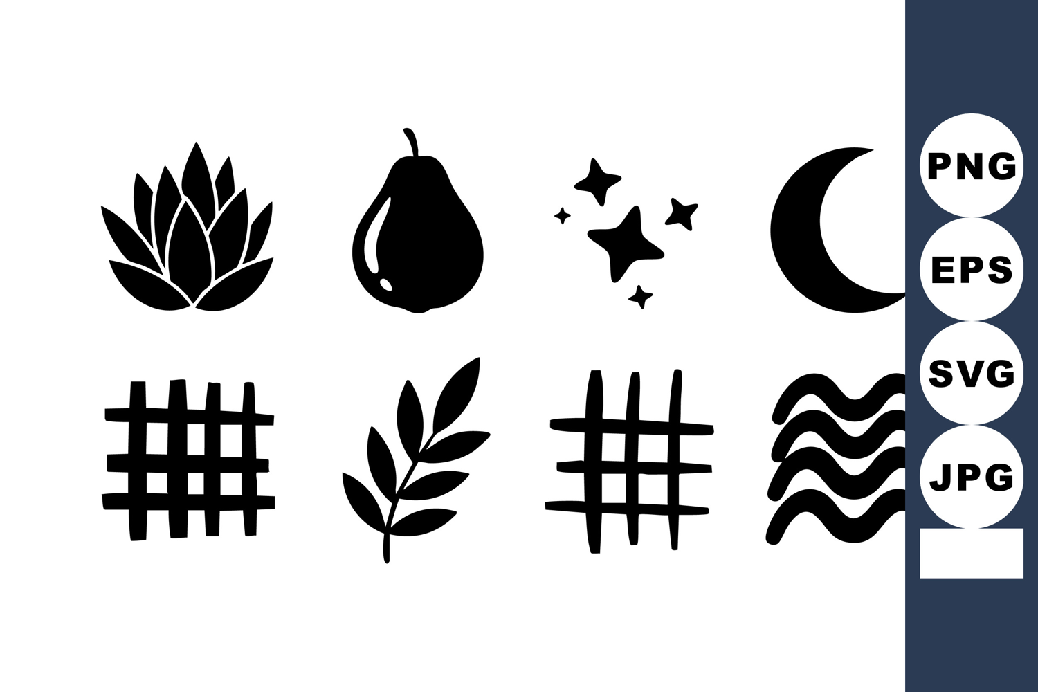 Set of abstract black nature symbols featuring lotus flower, pear fruit, crescent moon, stars, leaves, and water waves in a simple vector style. Minimalist and versatile design. Calm mood.