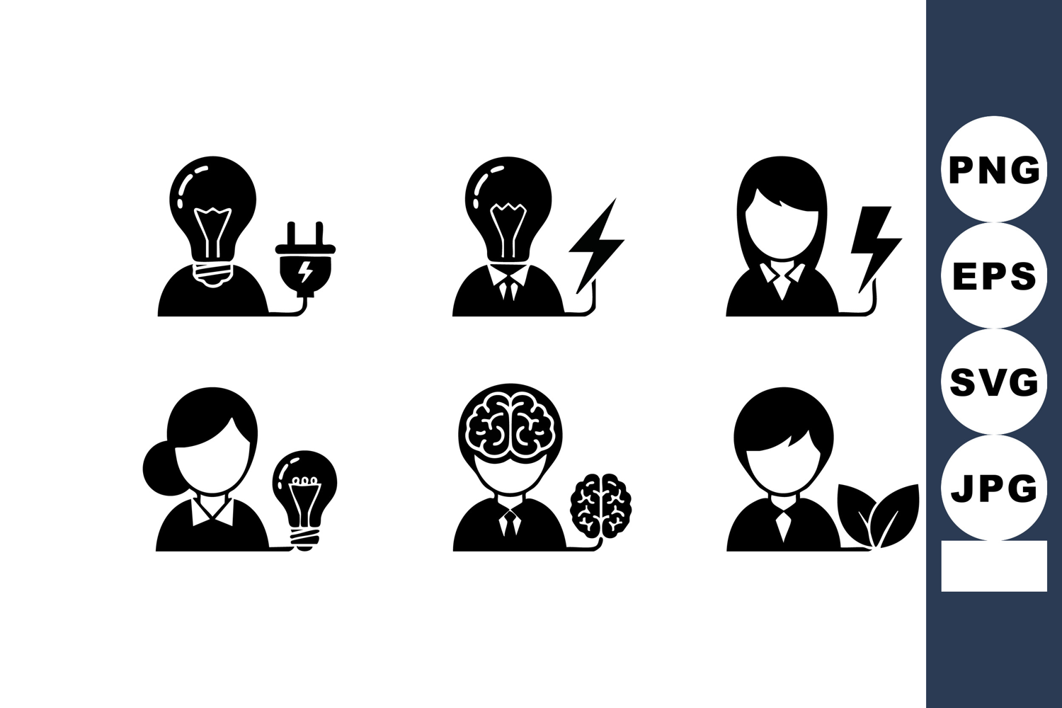 Set of black silhouettes showing businesswomen with light bulbs, electric plugs, lightning bolts, brain ideas, and eco leaves, representing innovation and sustainability. Simple, modern, inspiring.