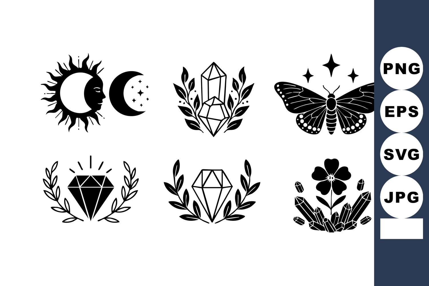 This vector collection features black mystical icons including sun, moon, crystals, butterfly, diamond, and flower with leaves, presenting a magical and elegant style. Enchanting mood.