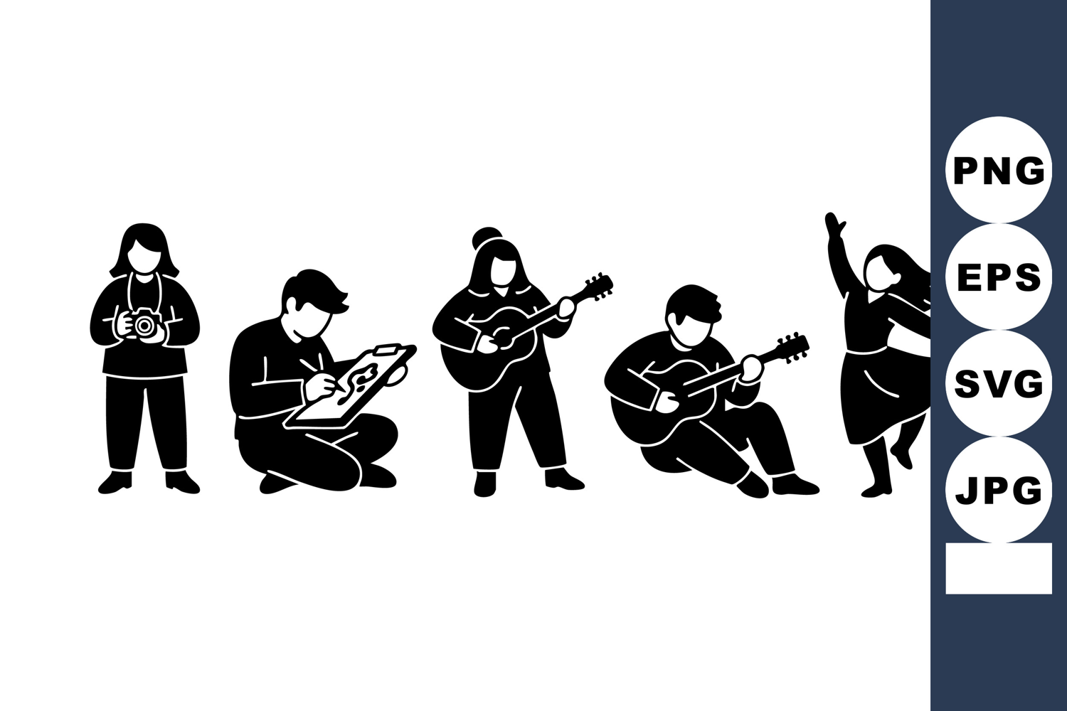 Silhouettes of a music band performing with two guitarists, a singer, a dancer, and another musician, all in black and white vector style. Dynamic and artistic mood.
