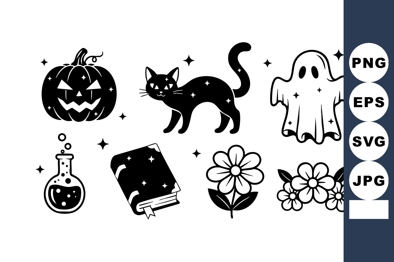 This vector set features Halloween icons including a black pumpkin, cat, ghost, potion, book, and flowers, all in black and white style with sparkles, creating festive spooky mood.