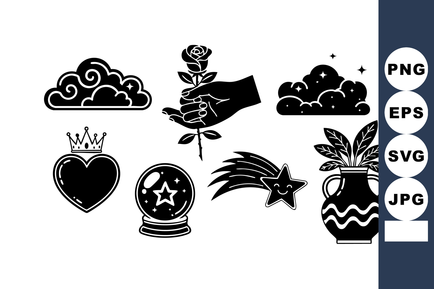 Vector icons feature mystical elements including stars, clouds, crowned heart, rose held by hand, shooting star, and decorative vase in black and white style, creating magical mood.