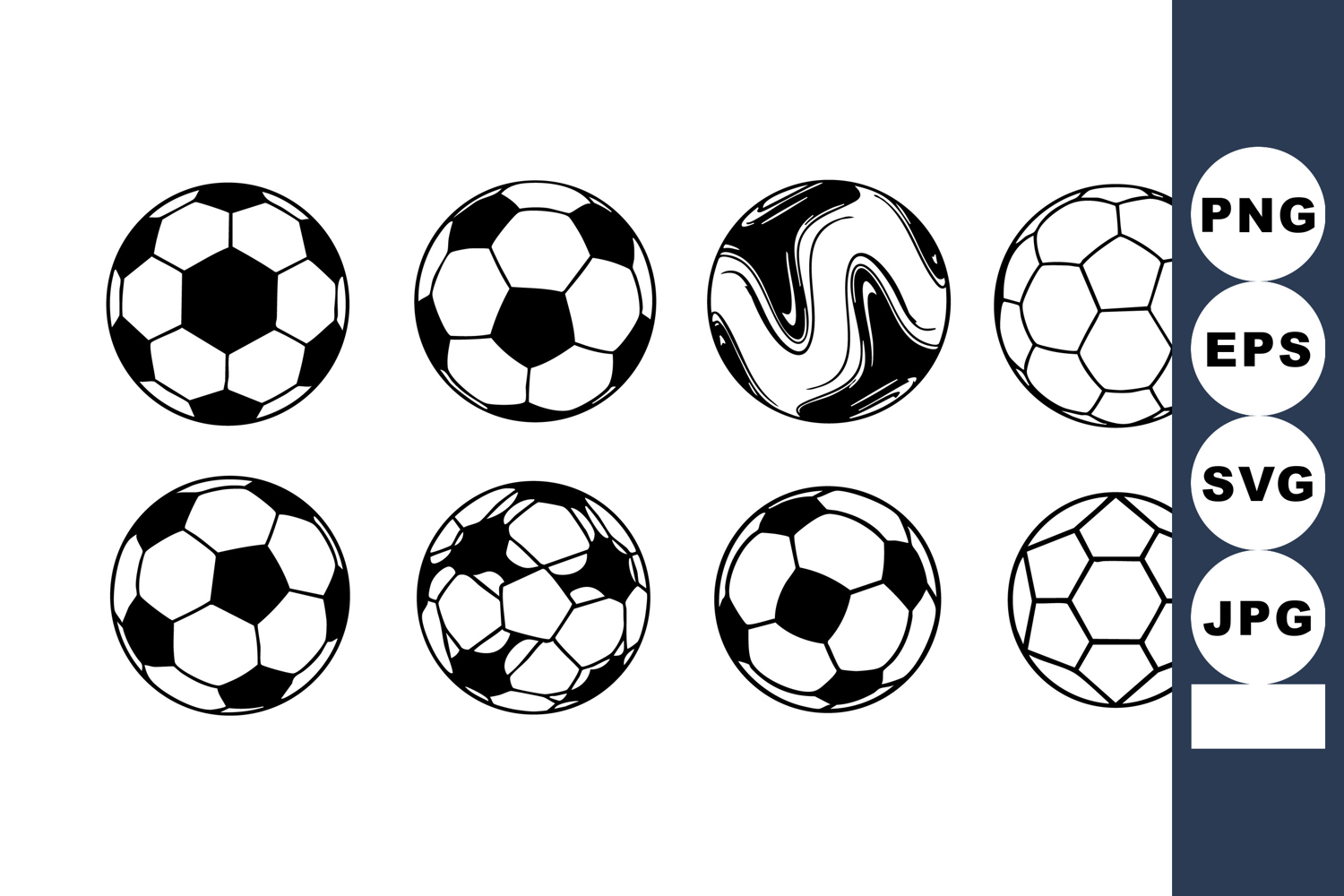 Illustration shows eight soccer balls featuring different classic and modern panel designs arranged in two rows, representing sports and recreation with a dynamic feel.