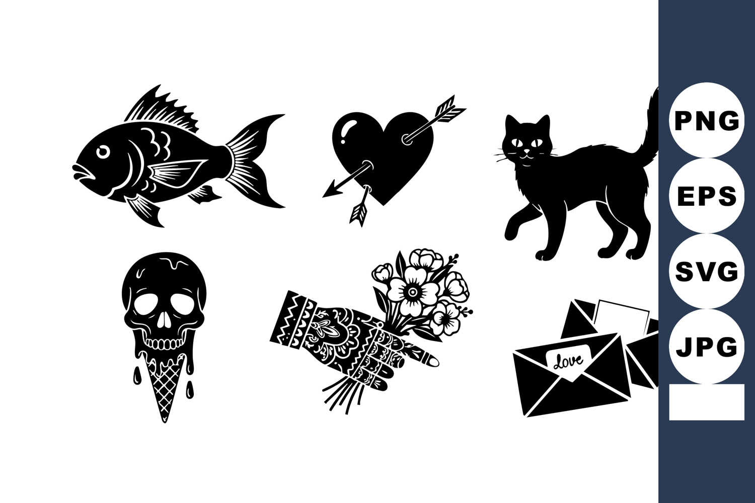 Black silhouette collection of fish cat skull ice cream hear example image 1