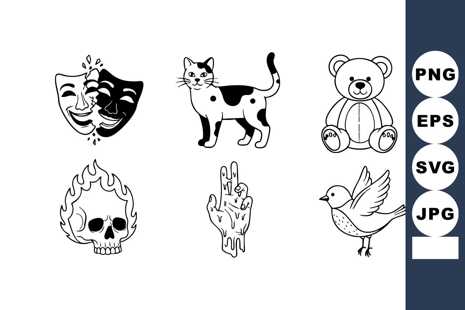 This set of six black and white vector icons displays comedy tragedy masks, a cat, teddy bear, flaming skull, zombie hand, and flying bird. Ideal for creative and versatile design projects. Artistic mood.