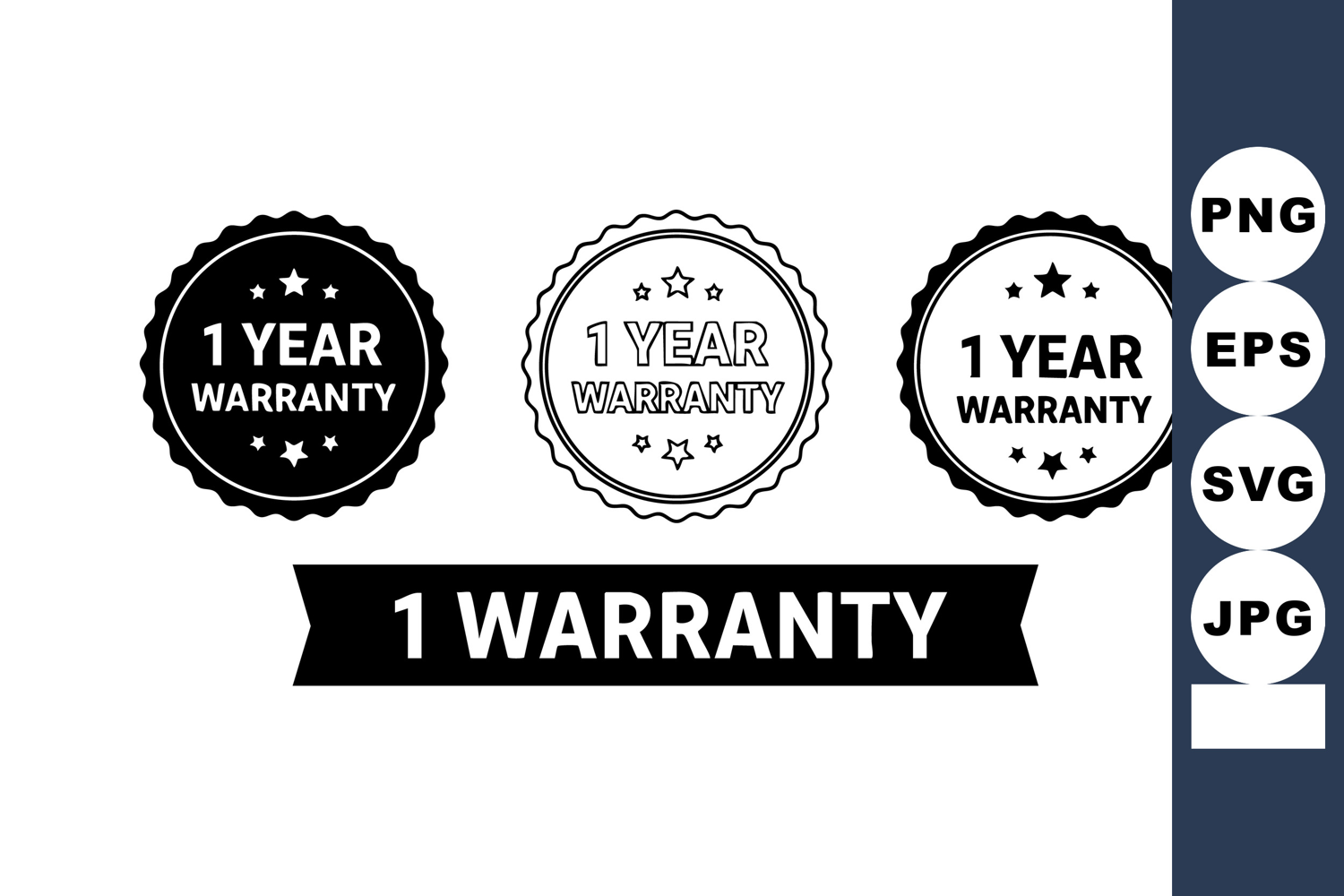This vector features three one year warranty badges with stars and a ribbon banner, presented in black and white, suitable for product guarantee design, clean and professional style.