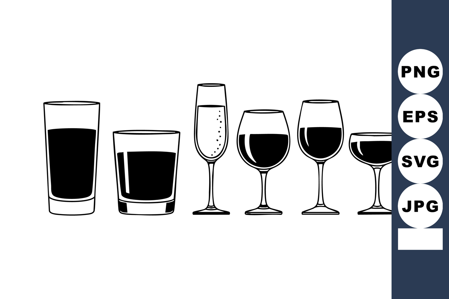 Six Different Types of Glasses with Various Drinks Black and example image 1