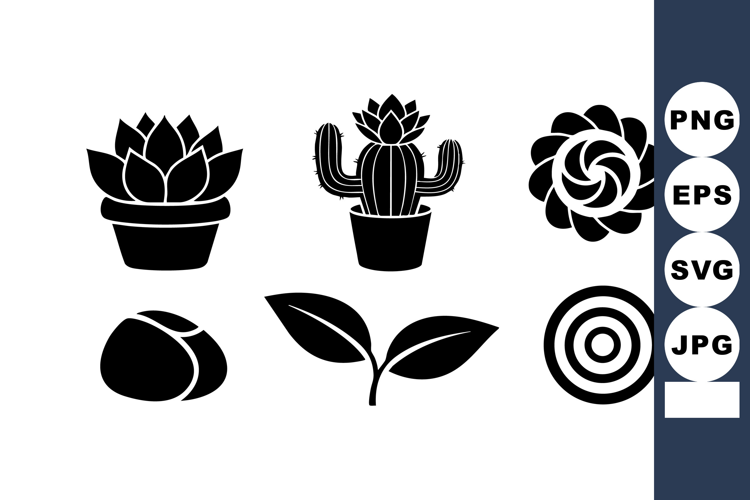 This vector features black silhouette icons including a cactus, lotus flower, seed, leaf, and target symbol, presented cleanly for versatile design use. Simple and elegant style. Calm.