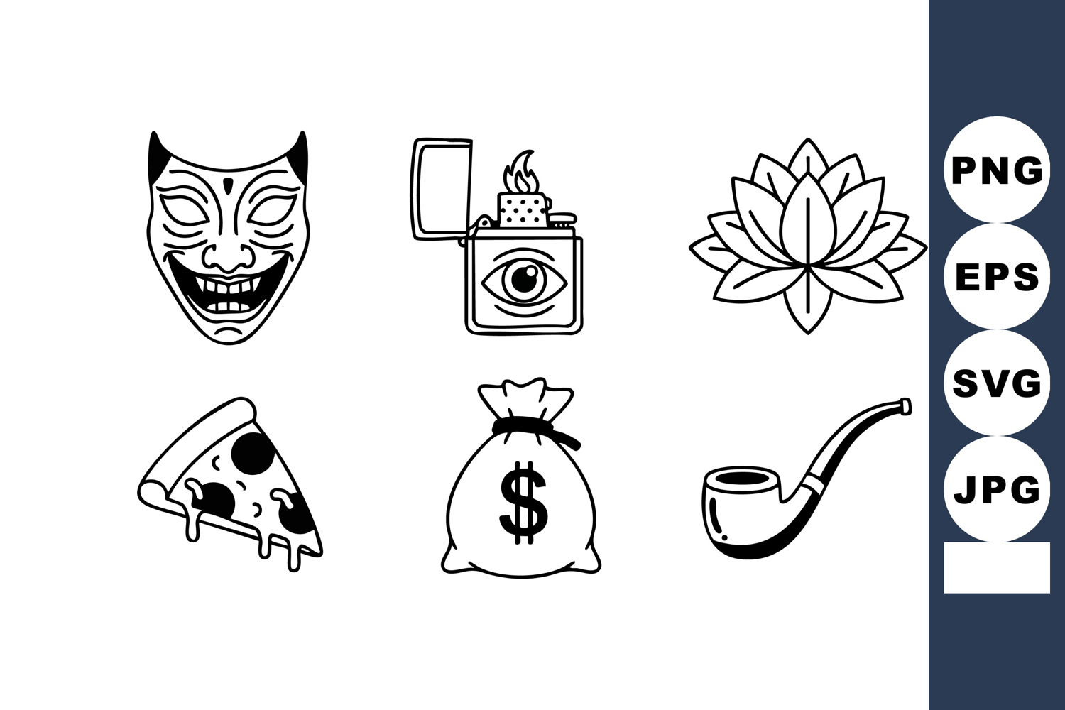 This vector file shows six black and white icons featuring a comedy mask, lighter with eye, lotus flower, pizza slice, money bag, and smoking pipe in simple line art style. Minimalist and clear.