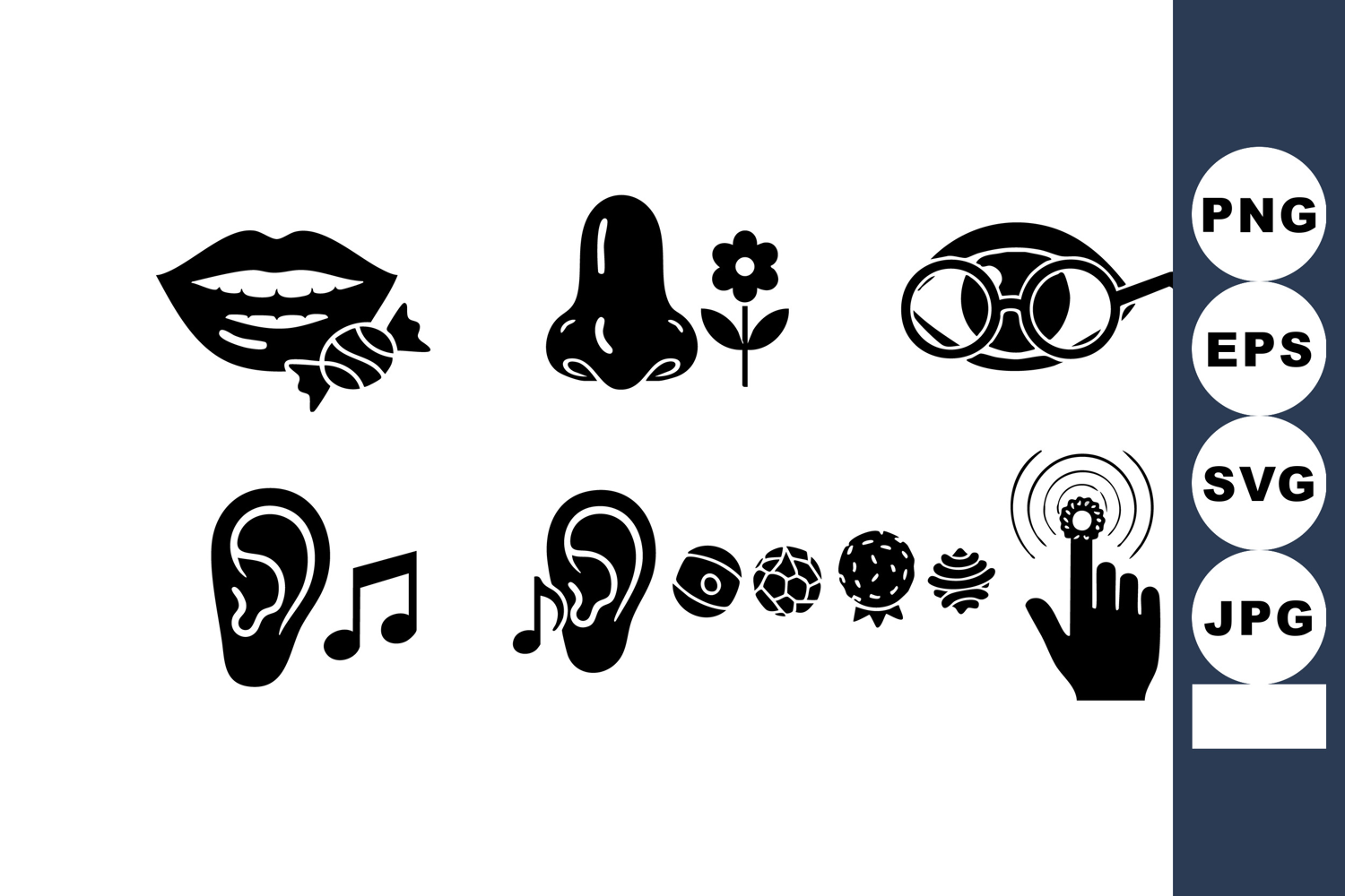 This vector features black silhouettes of sensory organs including lips with candy, nose with flower, glasses, ears with music note, eyes, and finger touching an icon, showing interaction and perception. Informative design.