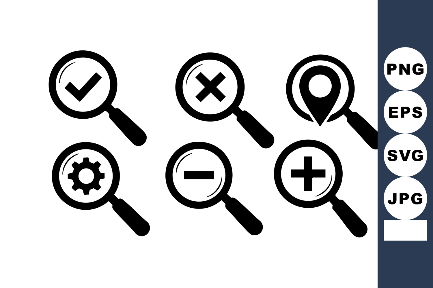 This vector features a set of magnifying glass icons with symbols including check, cross, gear, plus, minus, and location, designed in simple black style, clear and versatile. Modern and minimalistic.
