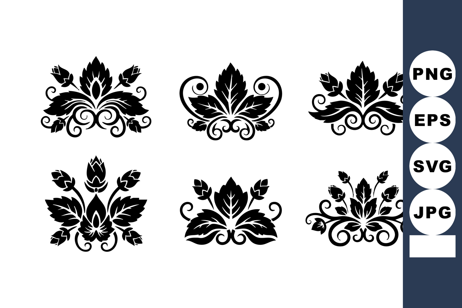 Set of six black floral vector elements featuring symmetrical leaf motifs and ornamental flourishes, perfect for elegant design projects and decorative patterns. Classic and stylish.