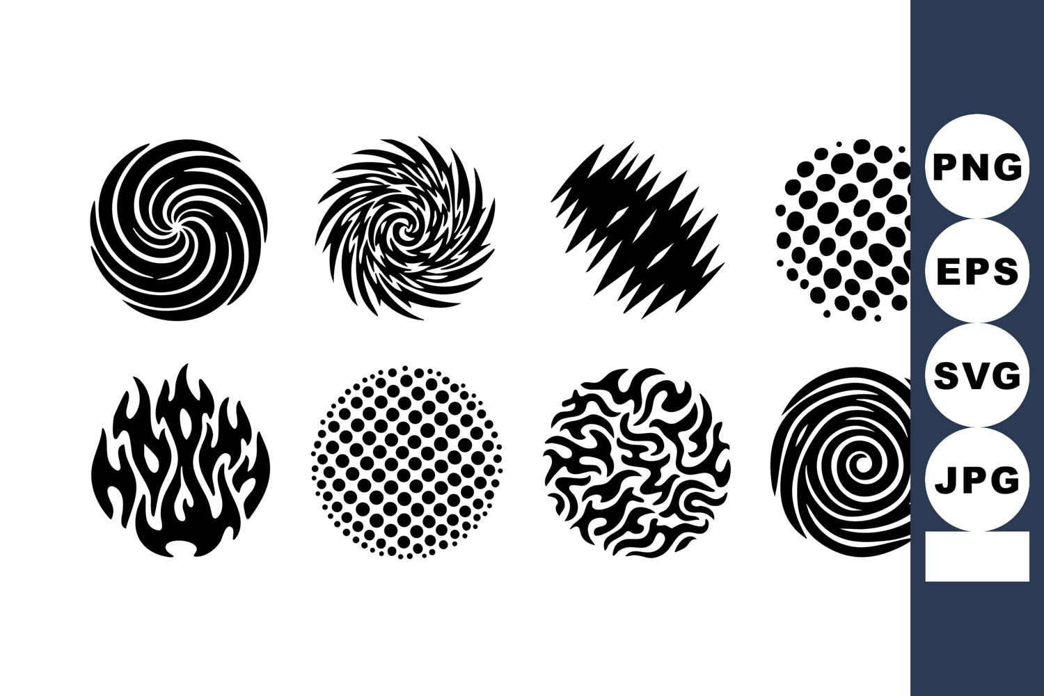 This vector features eight abstract black circular swirl shapes with dotted, flame, and zigzag patterns, ideal for creative graphic design and digital art projects, dynamic and artistic.