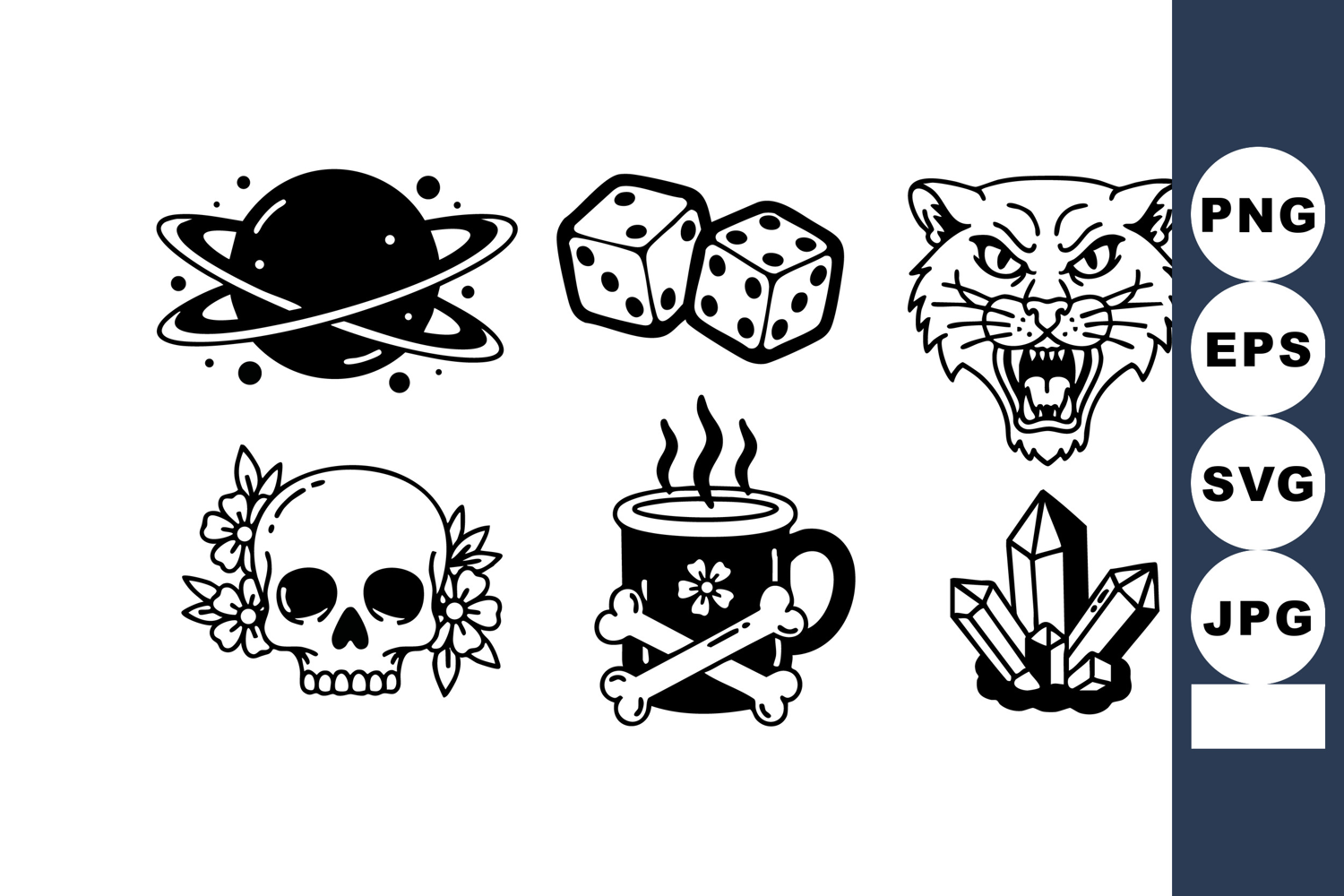 Similar Design Products to Collection of spooky tattoo style vector icons with planet,