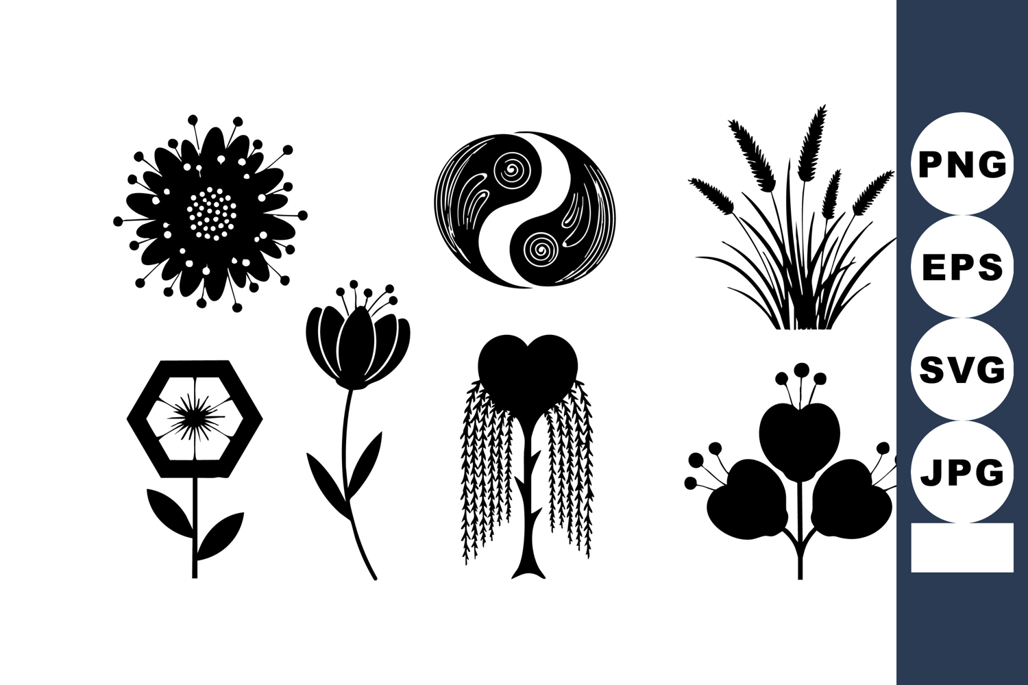 This vector file presents black silhouette floral designs including a yin yang symbol and multiple stylized flowers and plants arranged in a clean layout, creating an artistic and minimalistic mood.