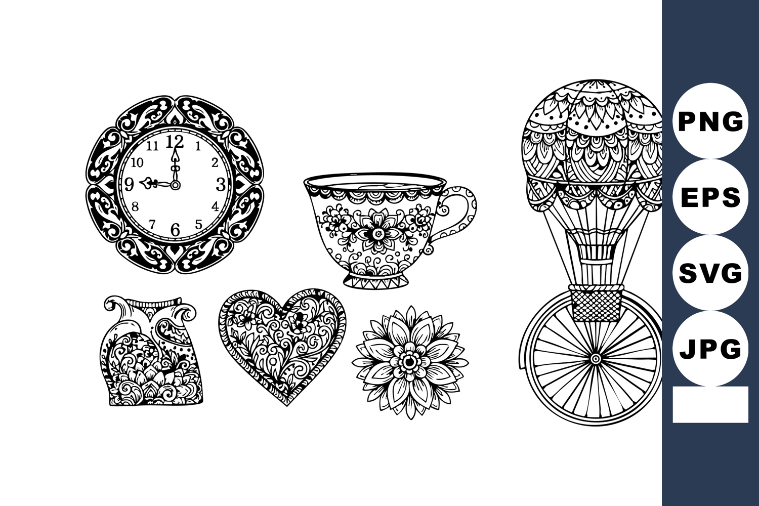 Collection of vintage decorative elements including a clock, teacup, heart, flower, and hot air balloon in delicate black line art style. Elegant and intricate mood.