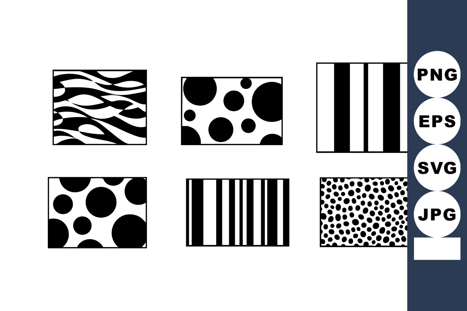 This vector file presents six black and white geometric patterns including stripes, dots, and spots in an abstract seamless design style perfect for creative projects and modern aesthetics. Minimalist and bold.