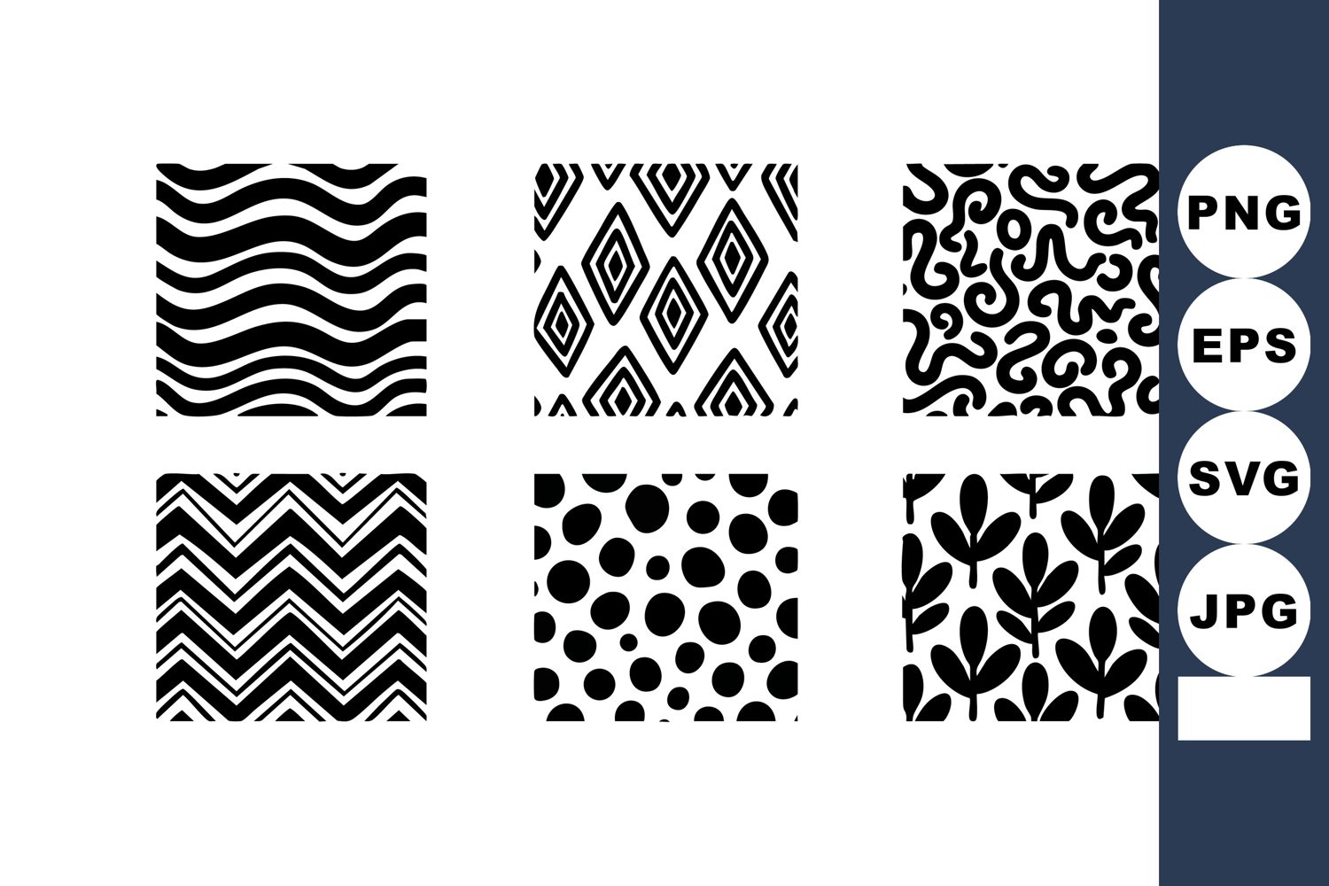 This vector file features six black and white seamless patterns with geometric and organic shapes, suitable for design, decoration, and textile use. The style is modern and versatile.