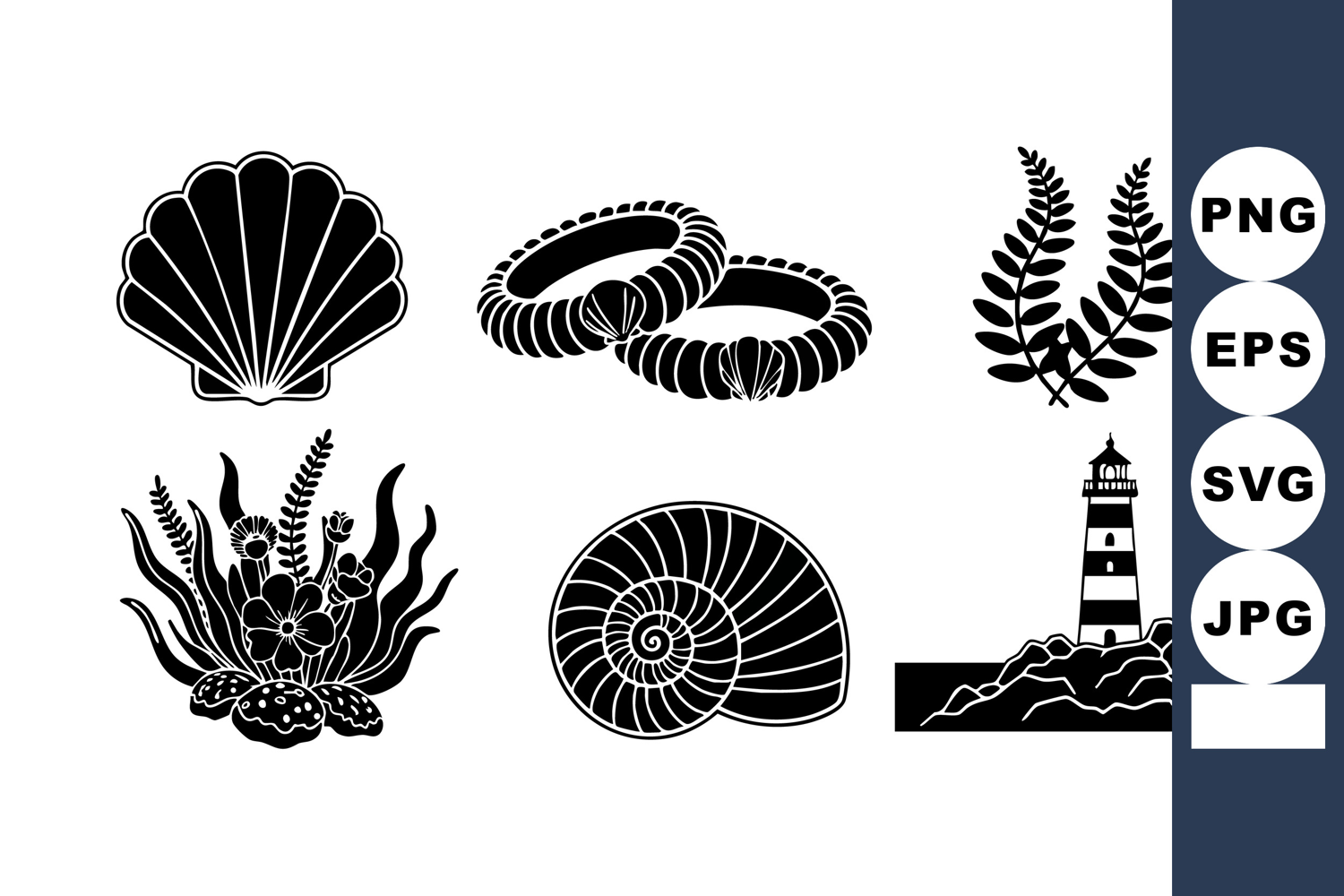 This vector set features black silhouette illustrations of seashells, seaweed, coral, a lighthouse, and marine elements ideal for creative projects with a nautical mood.
