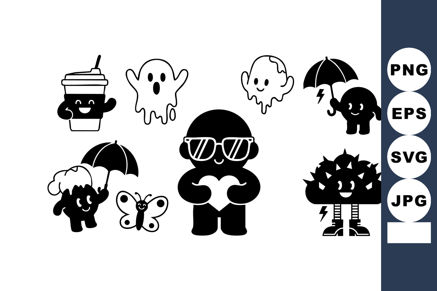 This vector set features charming black and white icons including ghosts, coffee cup, umbrella, butterfly, heart, and thunderstorm characters with playful expressions. Fun and whimsical mood.